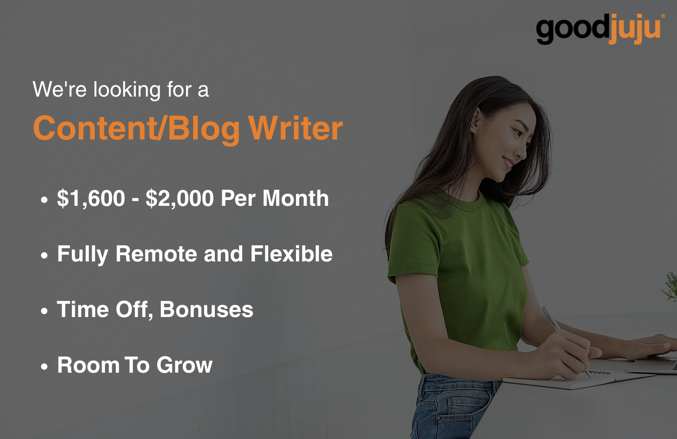 Goodjuju believes that as we help our clients grow, and as we grow Goodjuju, we (team members) should be rewarded accordingly. You can expect to be paid above average, get bonuses, and have opportunities to learn and grow (if you help our clients and us win).